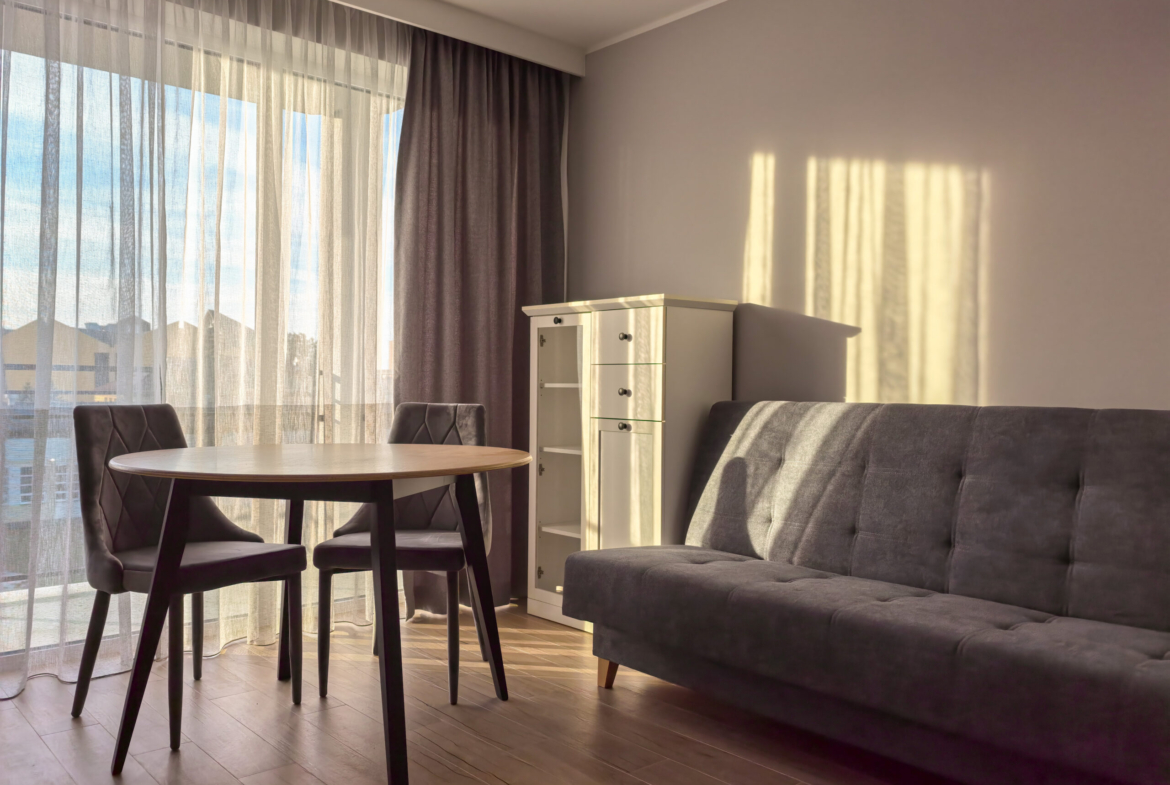 - Salon z aneksem kuchennym: Przestronny salon połączony z funkcjonalnym aneksem kuchennym, z bezpośrednim wyjściem na taras. Dzięki garderobie pełniącej funkcję szafy, salon został urządzony w minimalistycznym stylu.